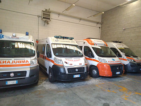 Il nostro parco auto è composto da 6 ambulanze di cui 1 allestita come centro mobile di rianimazione, 2 veicoli speciali muniti di pedana per il trasporto disabili e 2 vetture per trasporti secondari semplici.